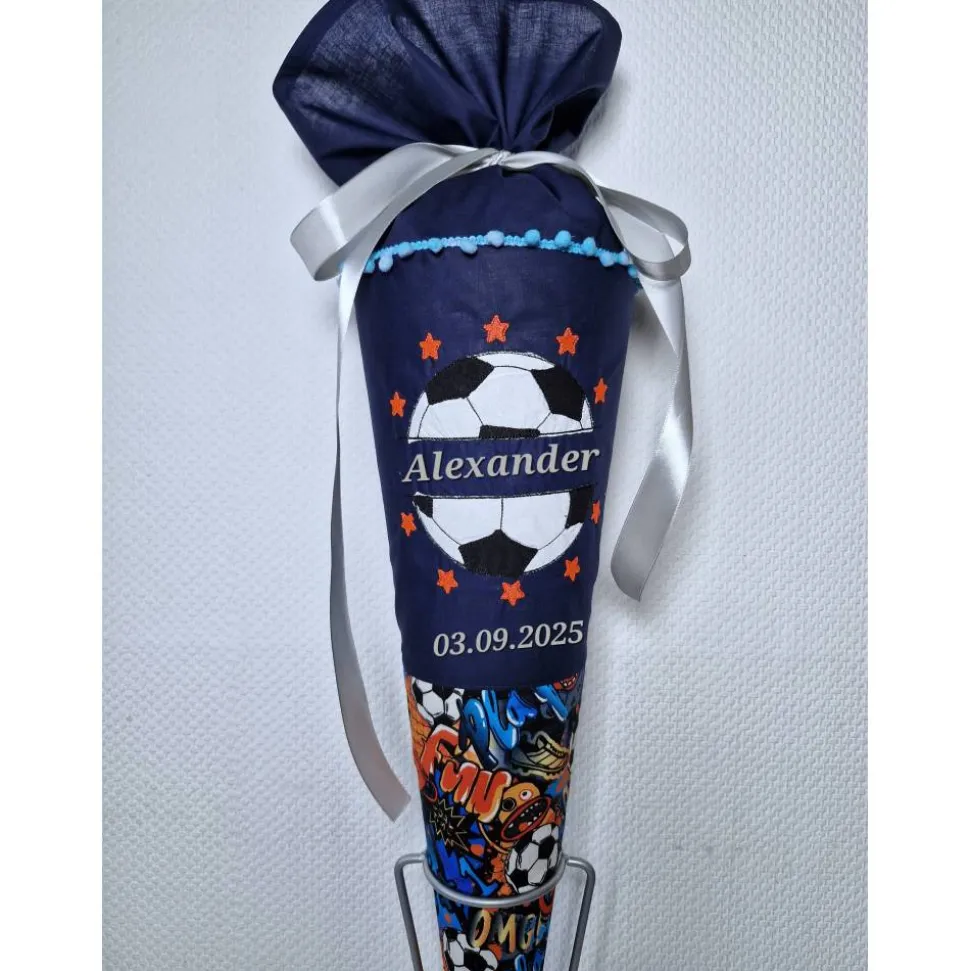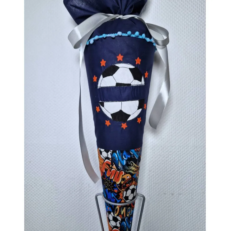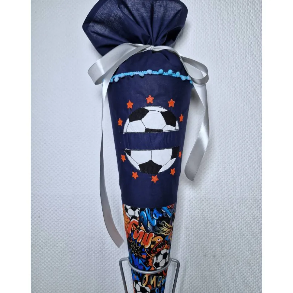 Dies ist eine Schultüte mit einem Fussball. Der untere Teil der Tüte besteht aus einem Stoff mit Fussball Motiven.