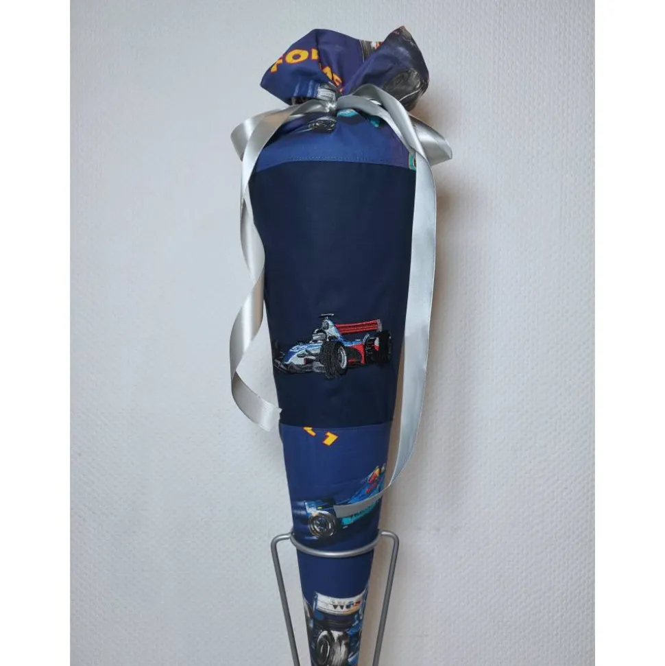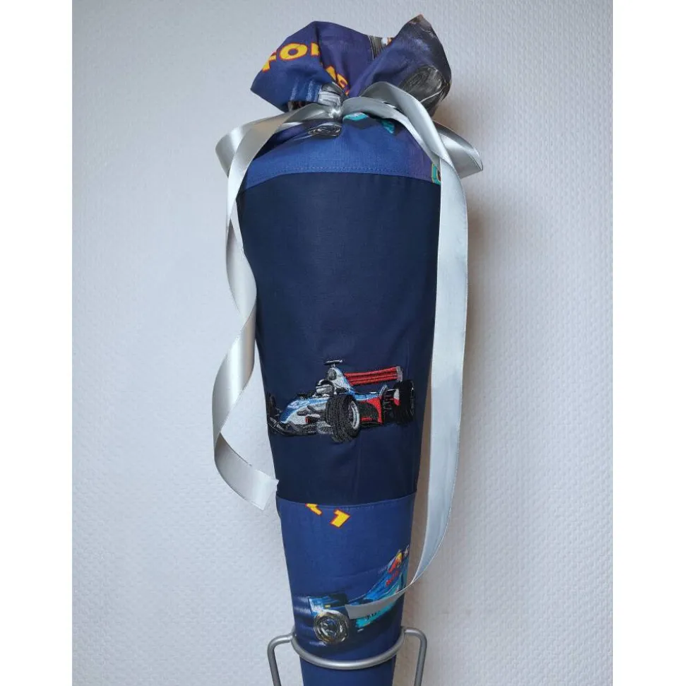Dies ist eine Schultüte mit einem Rennauto. Der untere Teil der Tüte besteht aus einem Stoff mit Autorennen Motiven.
