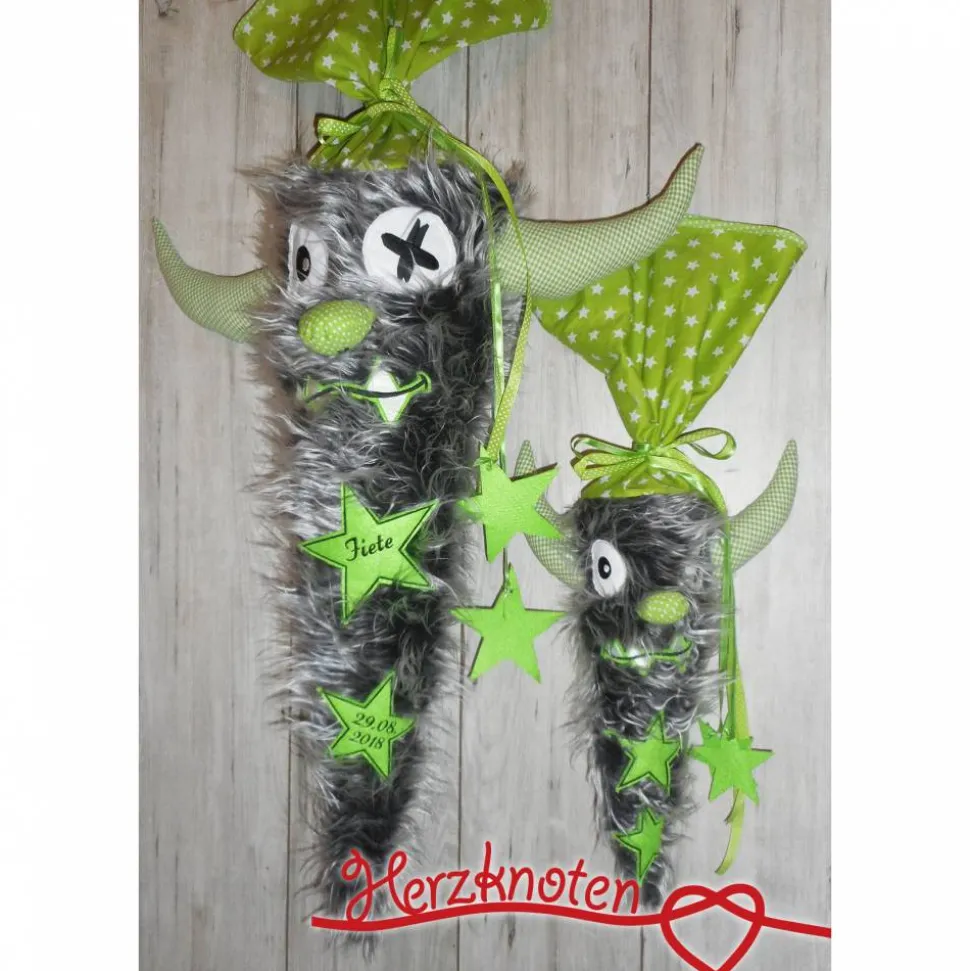 Die Stofftüte ist ca 95cm lang und bietet so genug Platz für die Füllung und um oben schön zugebunden zu werden. Mit zwei verschieden großen grünen gestickten Filzsternen, worauf der Name des Kindes und z.B. das Datum der Einschulung Platz findet. Am einem Band sind auch noch mal zwei Sterne befestigt.