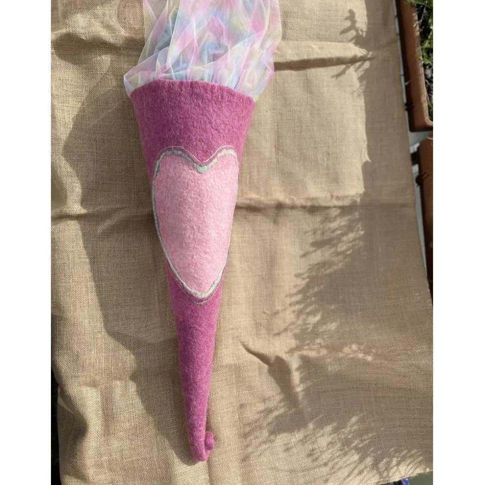 Die Schultüte wurde nassgefilzt, die Öffnung wurde mit dem hochwertigen Tüll und Baumwollestoff sorgfältig und sauber per Hand an die Tüte angenäht.