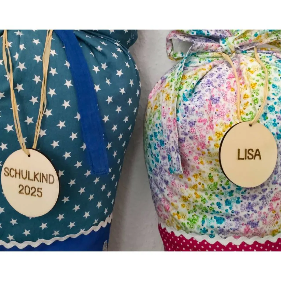 Beidseitig gravierter Schultüten-oder Schulranzen-Anhänger aus Pappelsperrholz mit der Aufschrift„Schulkind + Jahreszahl“ auf der einen und dem eigenen Namen aufder anderen Seite – ebenfalls als perfektes Erinnerungsstück oderDekoration.