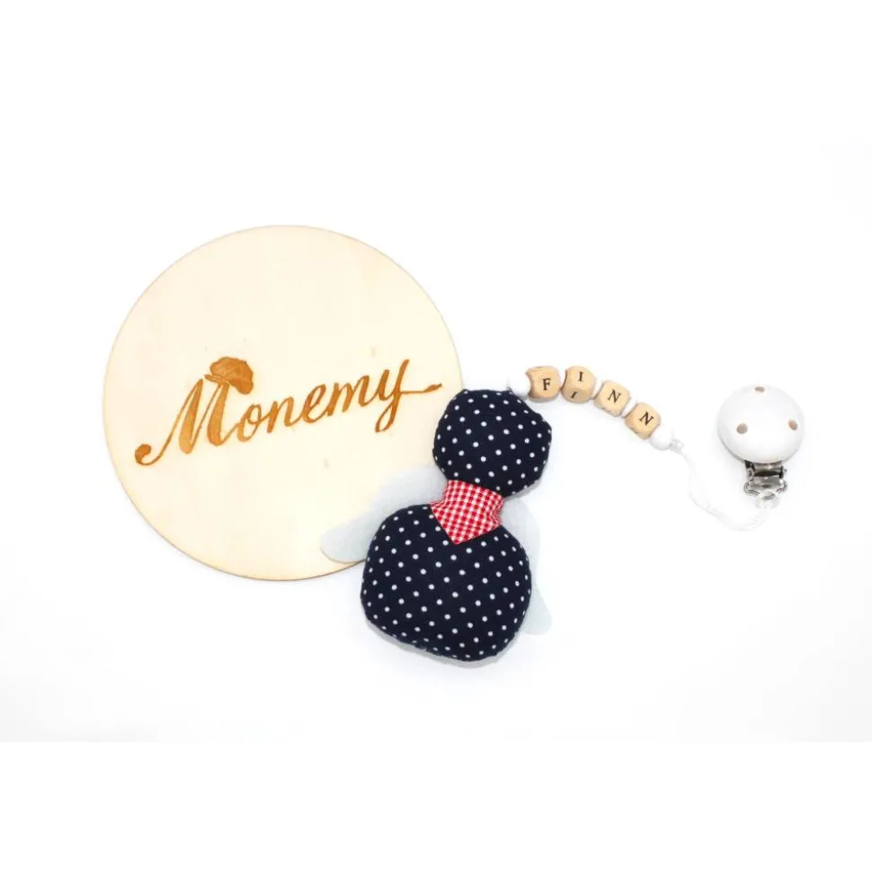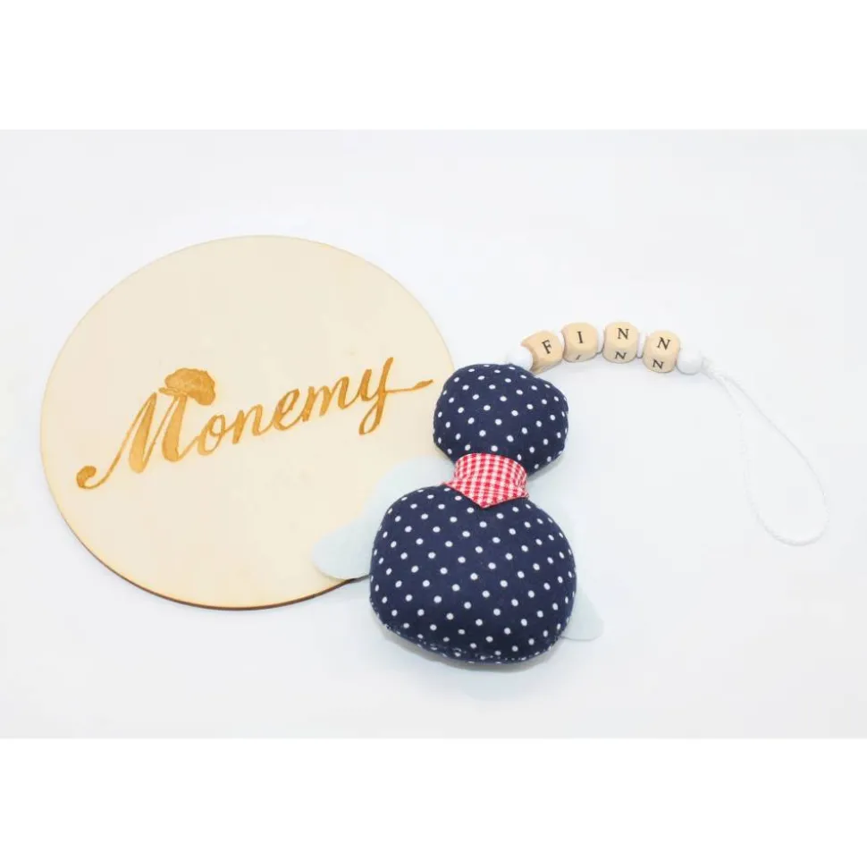 Der Knoten an der Schnur lässt sich leicht lösen um die Holzbuchstaben und Perlen zu entfernen. Die Flügel können auch entfernt werden, Somit lässt sich der kleine Engel prima per Handwäsche waschen.