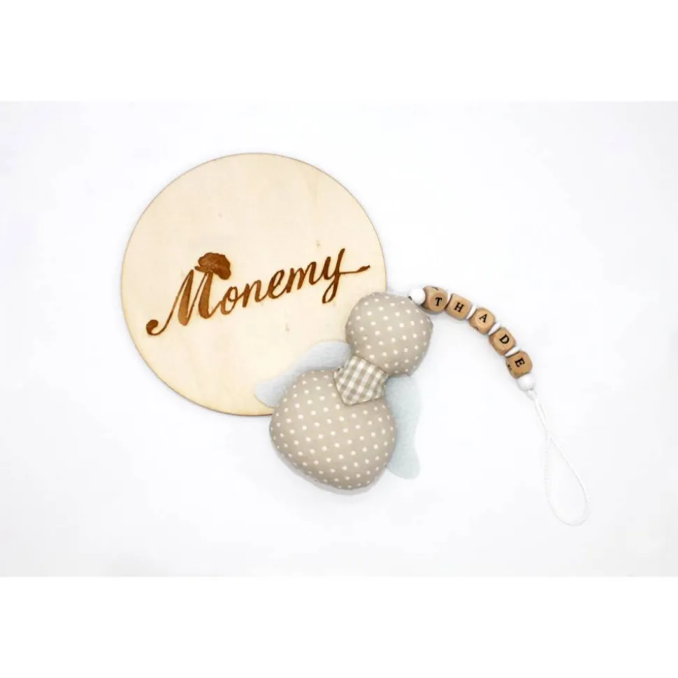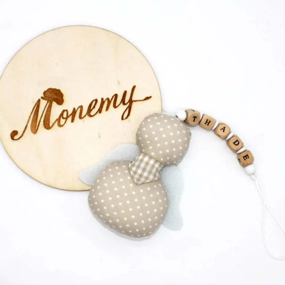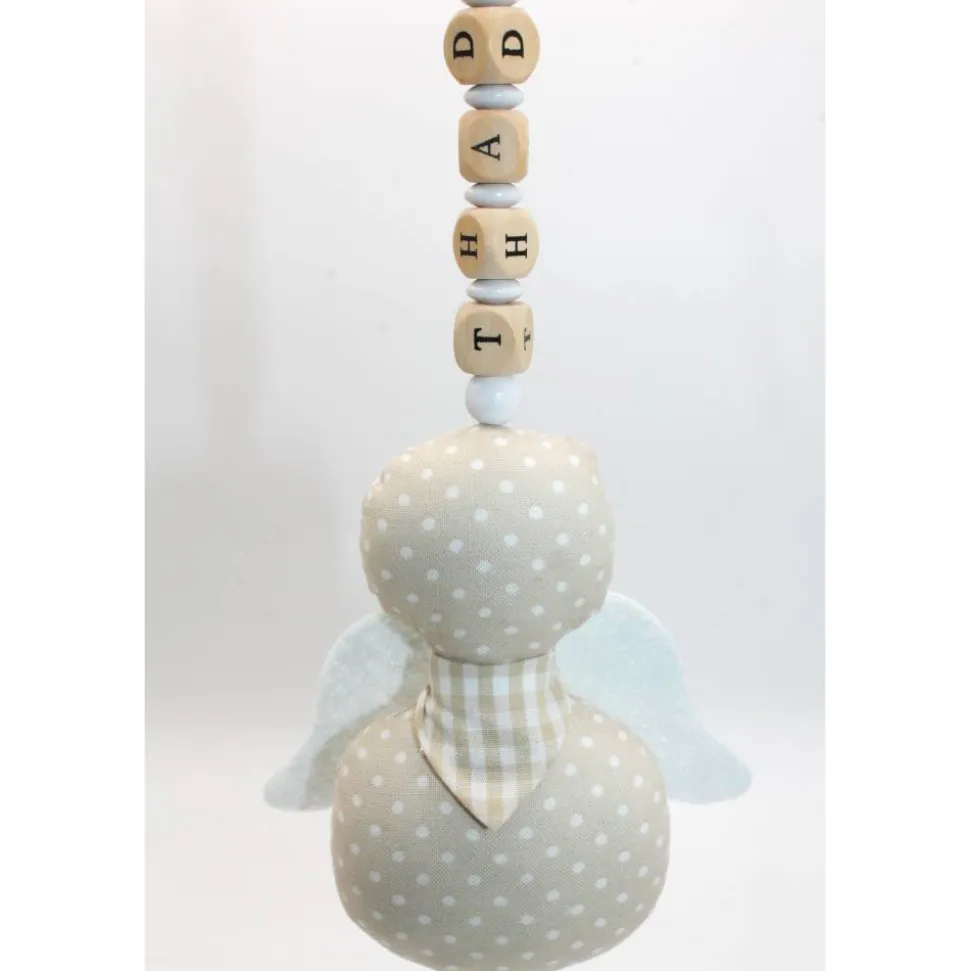 Der Knoten an der Schnur lässt sich leicht lösen um die Holzbuchstaben und Perlen zu entfernen. Die Flügel können auch entfernt werden, Somit lässt sich der kleine Engel prima per Handwäsche waschen.