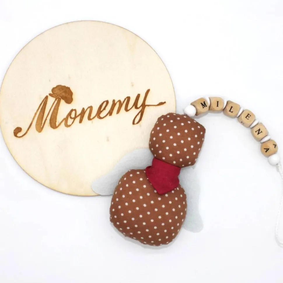 Der Knoten an der Schnur lässt sich leicht lösen um die Holzbuchstaben und Perlen zu entfernen. Die Flügel können auch entfernt werden, Somit lässt sich der kleine Engel prima per Handwäsche waschen.