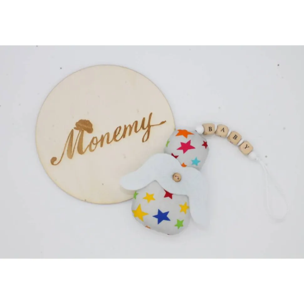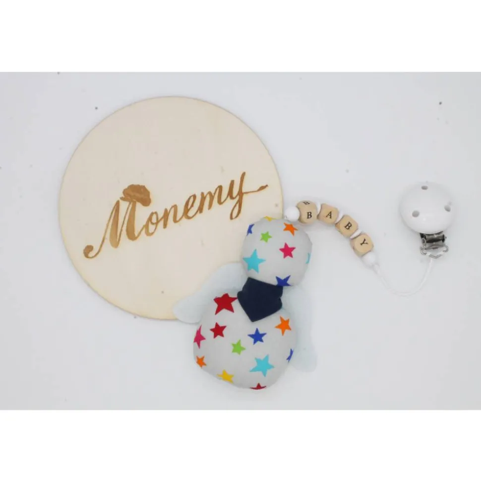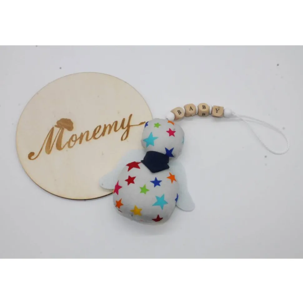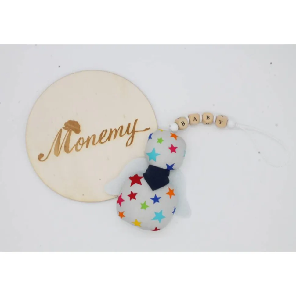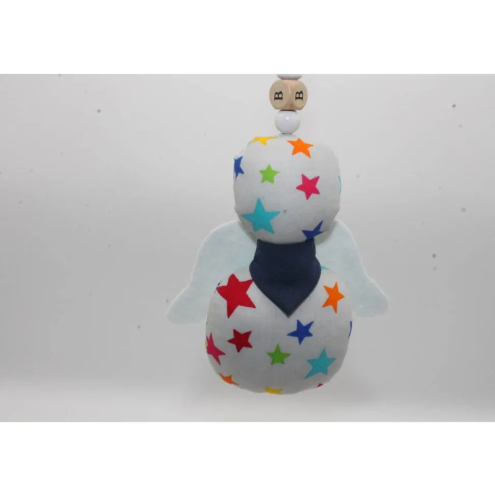 Der Knoten an der Schnur lässt sich leicht lösen um die Holzbuchstaben und Perlen zu entfernen. Die Flügel können auch entfernt werden, Somit lässt sich der kleine Engel prima per Handwäsche waschen.