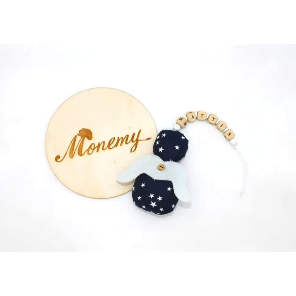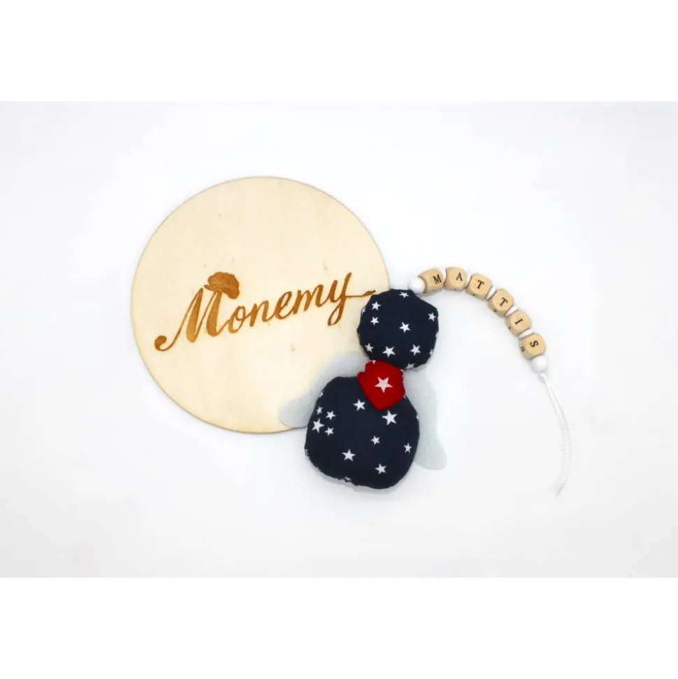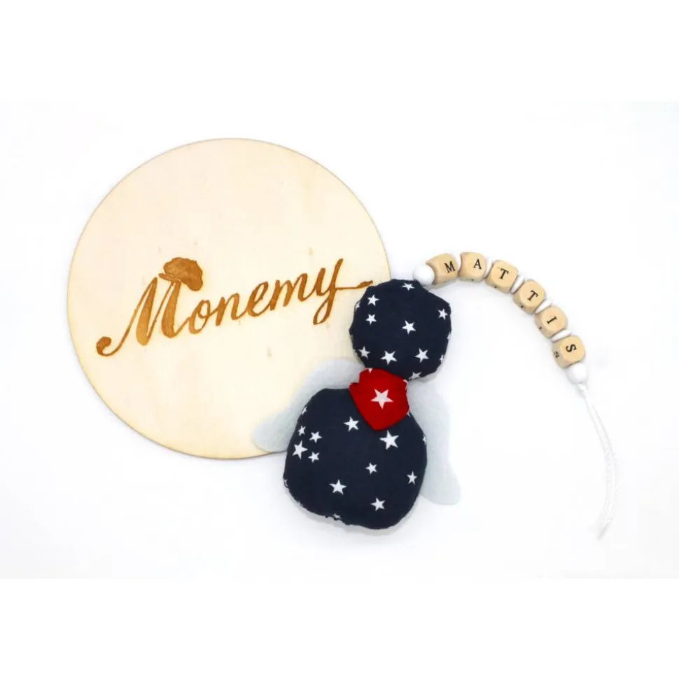 Der Knoten an der Schnur lässt sich leicht lösen um die Holzbuchstaben und Perlen zu entfernen. Die Flügel können auch entfernt werden, Somit lässt sich der kleine Engel prima per Handwäsche waschen.