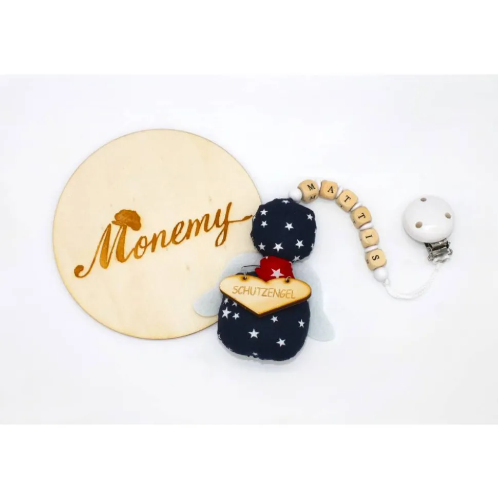 zusätzlich mit Holzclip weiß und Holzherz „Schutzengel“ um den Hals – 20,00 Euro