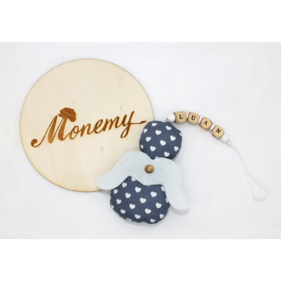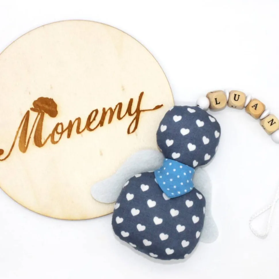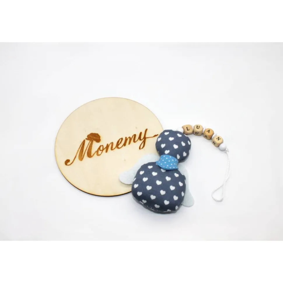 Der Knoten an der Schnur lässt sich leicht lösen um die Holzbuchstaben und Perlen zu entfernen. Die Flügel können auch entfernt werden, Somit lässt sich der kleine Engel prima per Handwäsche waschen.