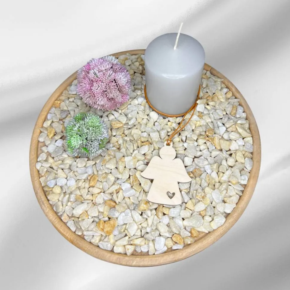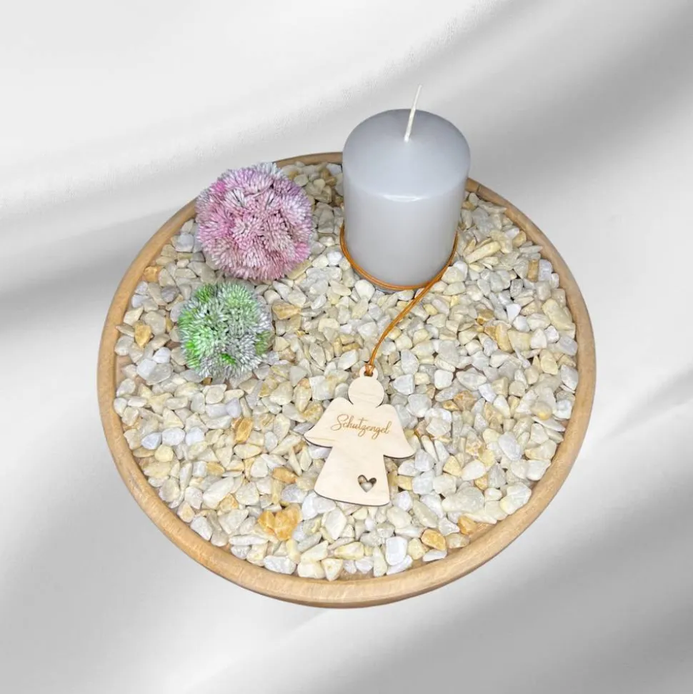 Dieser liebevoll gefertigte Holzanhänger in Form eines Schutzengels ist eine besondere Dekoration für feierliche Anlässe wie Taufe, Kommunion oder Konfirmation. Gefertigt aus hochwertigem Birkensperrholz, überzeugt der Anhänger durch seine natürliche Optik und filigrane Verarbeitung.