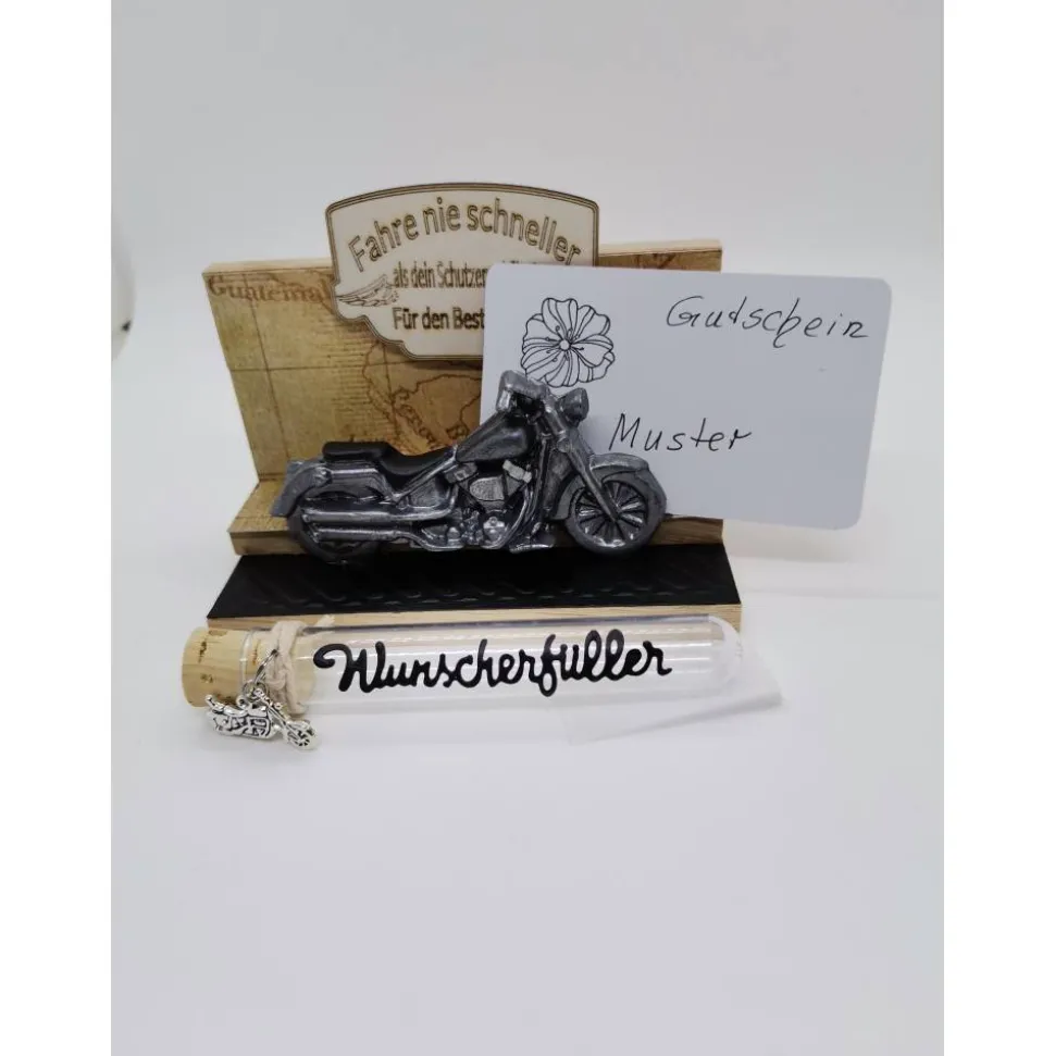 Das originelle Set besteht aus einem detailverliebt gegossenen Motorrad (ca. 8 cm x 3,5 cm aus Reliefgiesspulver gegossen und fest verklebt auf einem hochwertigen Holzständer (ca. B. 12 cm x H. 9 cm x T. 6 cm), der mit Designpapier veredelt und einer schützenden Filzunterseite versehen ist. Das Reagenzglas aus Kunststoff eignet sich perfekt für Geldscheine oder kleine Botschaften.