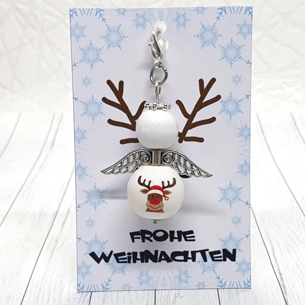 Der Schutzengel Rentier bringt besondere Eigenschaften mit: Er ist aus Holzperlen gefertigt, misst ca. 4cm ohne Karabiner und 5cm inklusive Karabiner. Die Flügelspannweite beträgt gute 3cm. Ein niedlicher Druck auf der Bauchperle macht jedes Stück einzigartig.