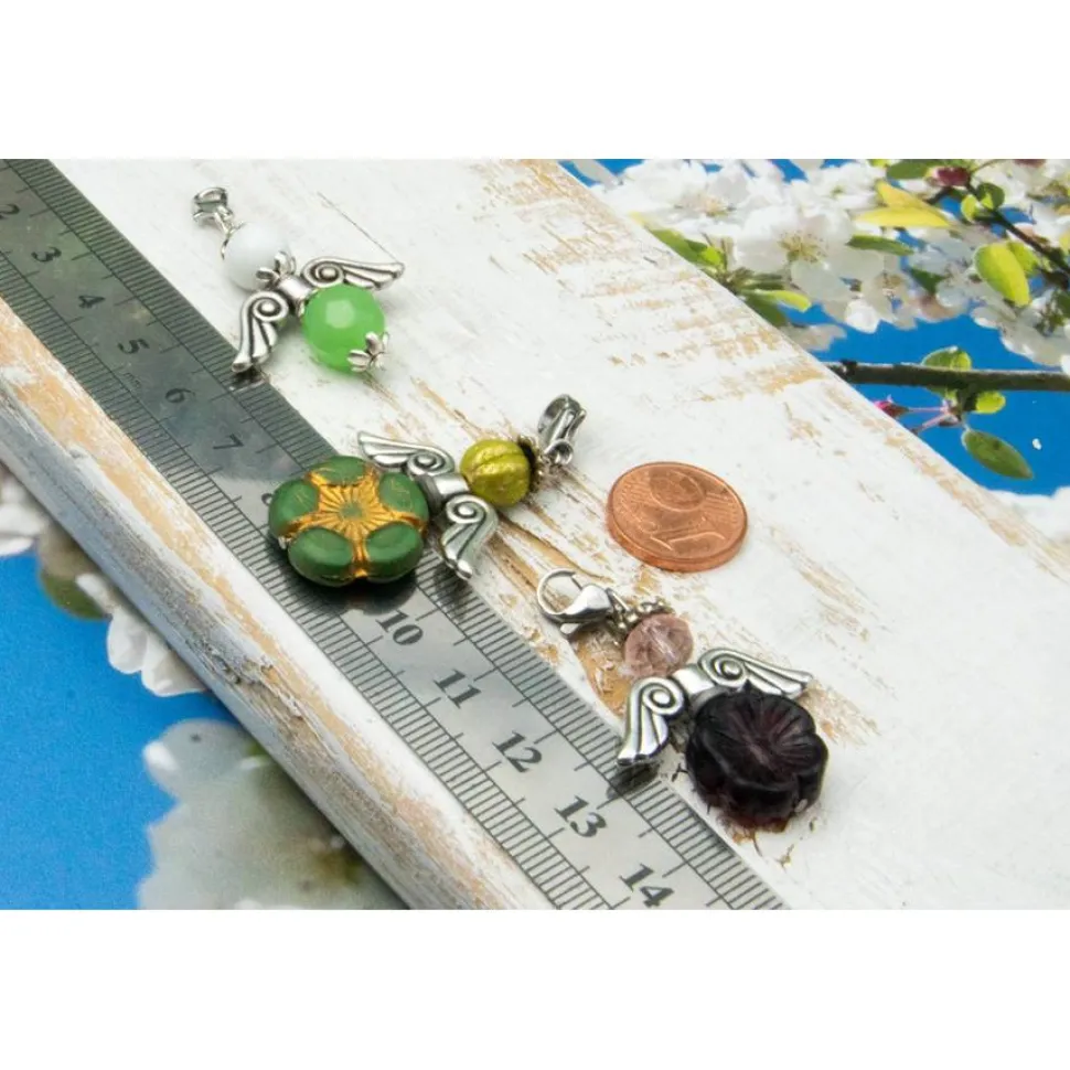 Drei wunderschöne, individuelle Schutzengelanhänger, in verschiedenen Größen, aus verschiedenfarbigen Glasperlen, böhmischen Glasperlen, Metallflügeln und Metallelementen mit Metallkarabiner.