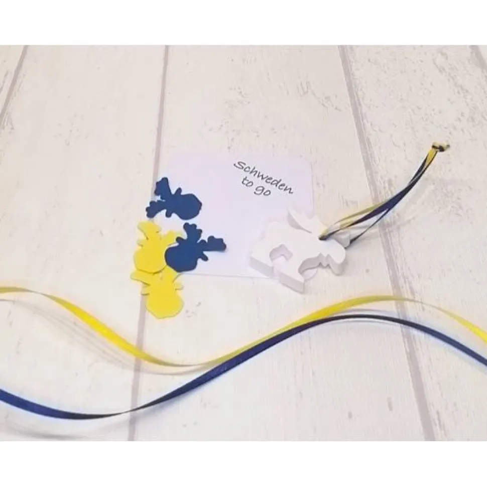 In der Tüte versteckt sich ein kleiner Elch, ca. 4×4 cm groß, sowie ein paar kleine Streuteile in Form eines Elchkopfes. Eine kleine Karte mit der Aufschrift „Schweden to go“ ist ebenfalls dabei. Die Tüte hat eine Göße von ca. 8×8 cm. Der Elch wurde aus Raysin gegossen. Raysin ist geruchlos, sowie lebensmittelneutral und besteht aus rein natürlichem Calciumsulfat (Quelle: Rayher.com). Da es sich um ein gegossenes Produkt handelt, kann es leichte Unebenheiten oder Lufteinschlüsse enthalten. Dies ist kein Reklamationsgrund.
