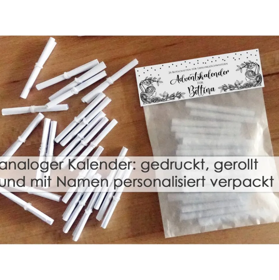 B) Beim analogen, fertig gestalteten Adventskalender für Schwestern bekommst Du bereits geschnittene, gerollte Botschaften, die in einer Pergamin-Tüte schön verpackt sind. Der Kaufpreis für diese Ausführung beinhaltet neben der Gestaltung der Verpackung mit Deinem Wunsch-Namen auch die Versandkosten.