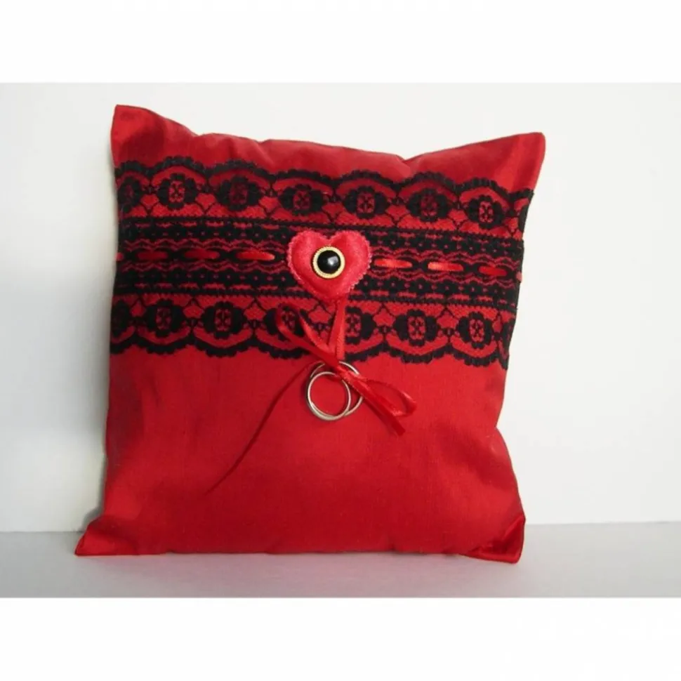 Zum Befestigen der Ringe 2 Paar rote Satinbänder. Passend zu dem Kissen gibt es auch ein rotes Spitzen-Strumpfband.