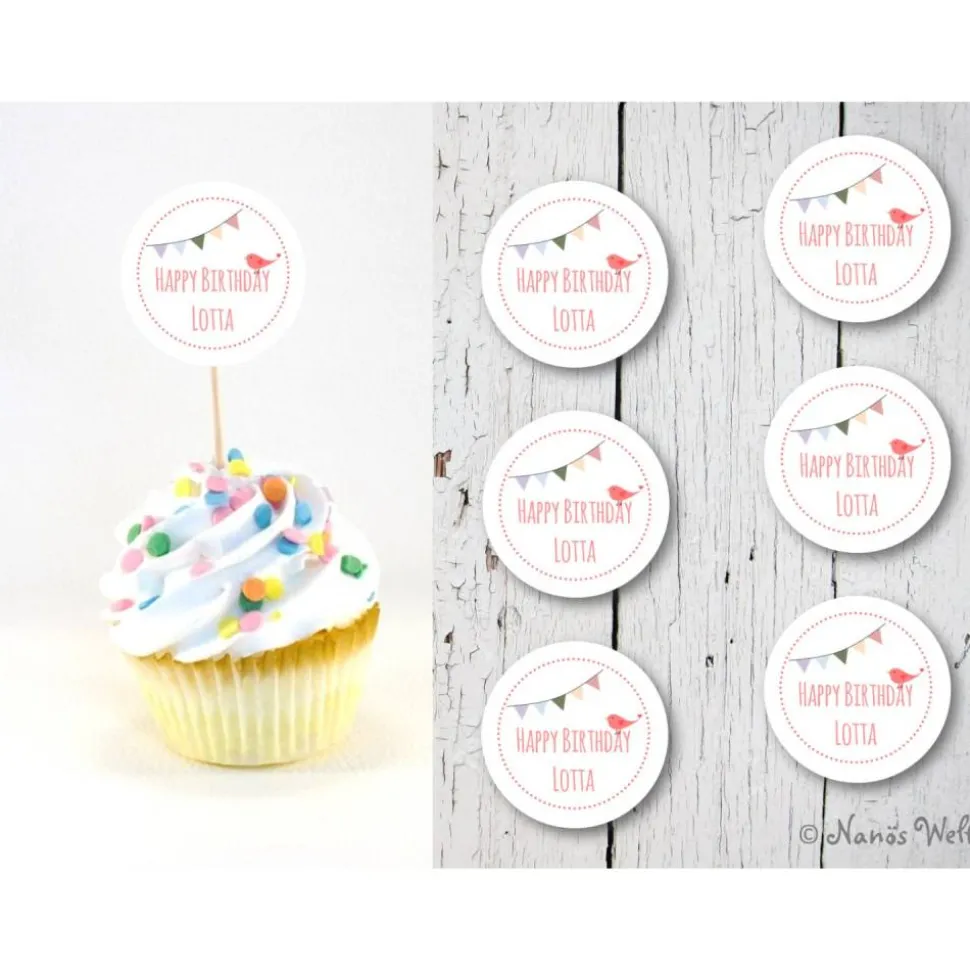 Unser besonderes Cupcake-Topper-Set besteht aus 6 Flags mit einer bunten Wimpelkette und individuellem Namen. Bitte gib bei der Bestellung den Namen des Geburtstagskinds und die gewünschte Farbe (rosa oder blau) des Vögelchens an.