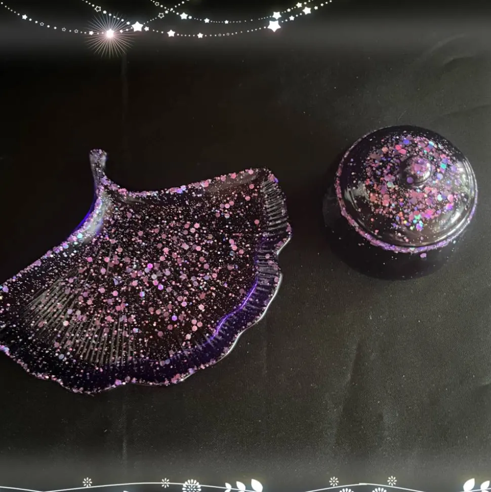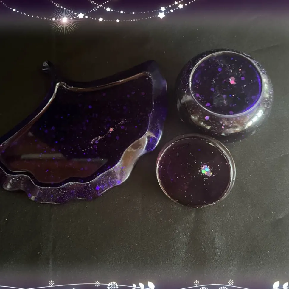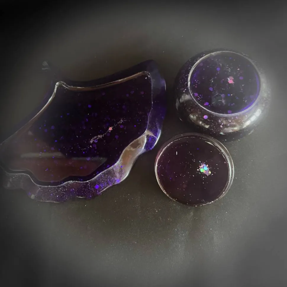 Das Resin habe ich in Lila und Glitzer eingefärbt. Das Material ist stabil und langlebig, was eine langfristige Nutzung ermöglicht.