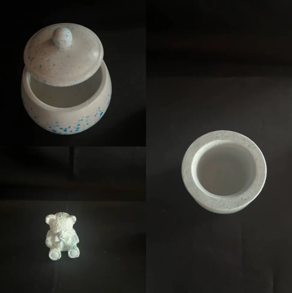 Tablett: 180 gr. Und der Durchmesser ist 16 cm der Teddy ist 4cm hoch