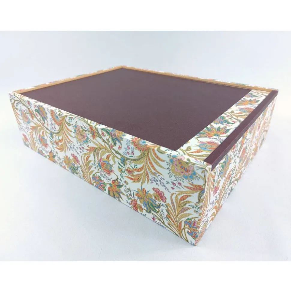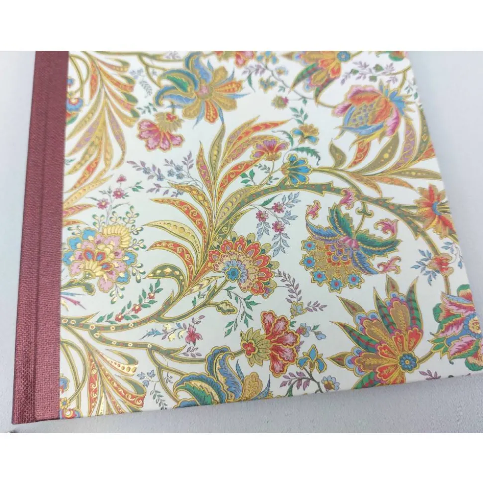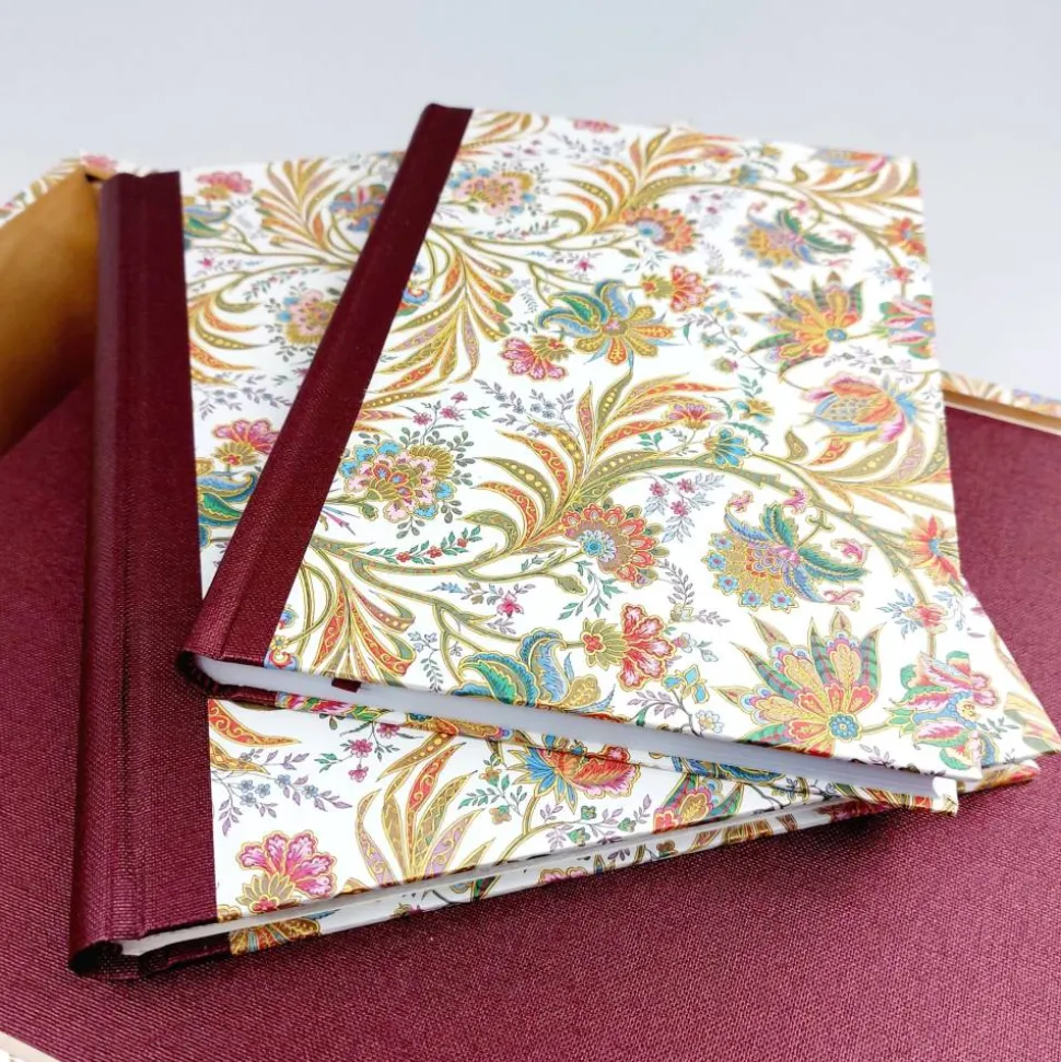Das Holz der Seitenwände innen habe ich geölt und poliert und so ist die Maserung wunderbar zu sehen. Außen ist die Box mit cremeweißem Papier mit filigranem Rankenmuster bezogen. Rot, grün, blau, rosa, gold… die Farben passen wunderbar zu dem Buchleinen mit Metallic Schimmer in der Farbe mangan / dunkelrot. Dieses beschichtete Buchgewebe habe ich bei der Box für den Holzdeckel, den Boden innen und außen verwendet. Es wiederholt sich im Buchrücken des Fotoalbums und vom Gästebuch.