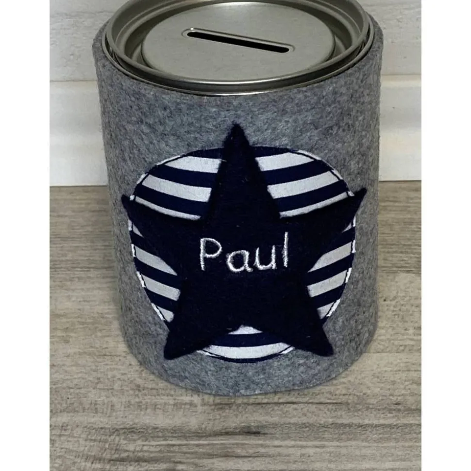 Eine tolle kleine Spardose aus Weissblech, mit Filzummantelung, grauer Filz, mit einem appliziertem Kreis mit dunkelblau-weiß gestreiften Stoff und applizieren Stern aus dunkelblauem Filz, bestickt mit Wunschname, in doodle Art gestickt, mit gewollt fransigen Stoff Appli, der Filz besteht aus 100% Polyester und hat aber die Optik & Haptik von Wollfilz.