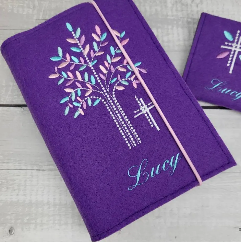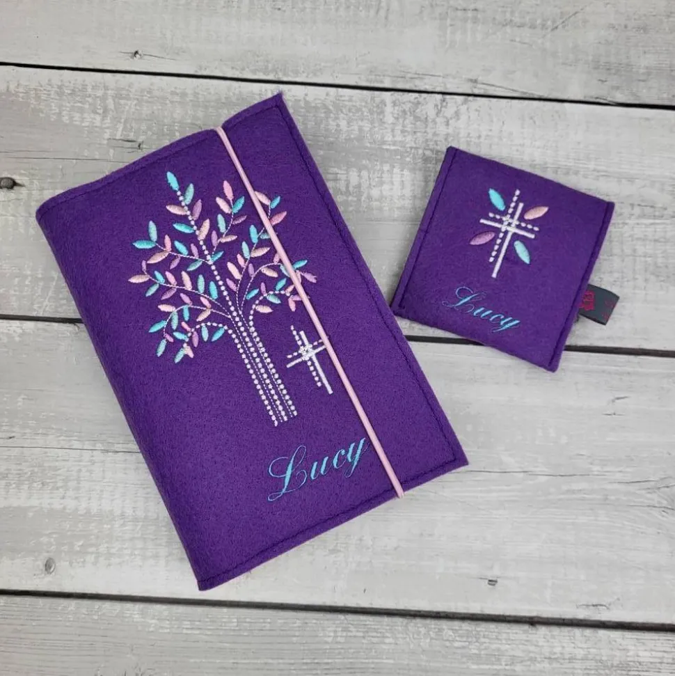 Hochwertige Gotteslobhülle aus Polyesterfilz (3,0 mm), bestickt mit einem Lebensbaum und kleinen Kreuz(gerne auch mit dem Namen und Datum).