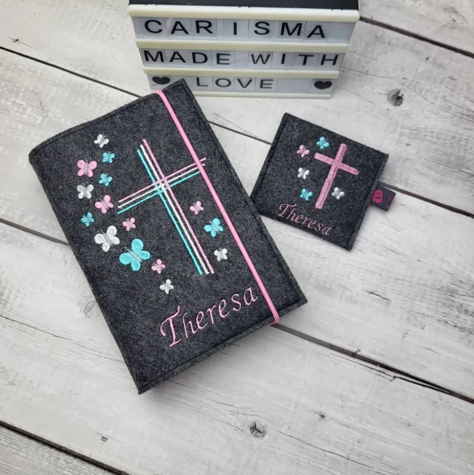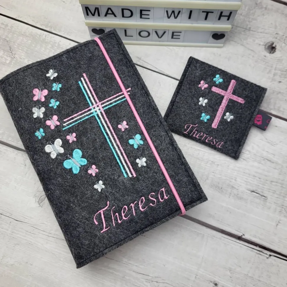 Hochwertige Gotteslobhülle aus Polyesterfilz (3,0 mm), bestickt mit einem Kreuz und Schmetterlingen (gerne auch mit dem Namen und Datum) mit passendem Rosenkranztäschchen.