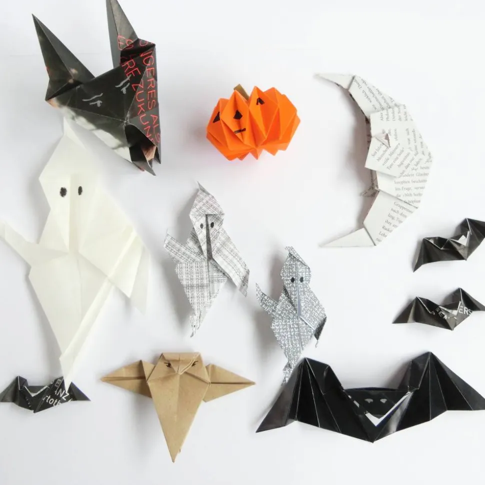 Verschiedene Sets an Origami Deko mit Spinnen, Geistern, Eule, Teufel, Kürbis, Mond und Fledermäusen fürs Fenster oder als Tischdeko. Außerdem Origami-Boxen für Süßigkeiten