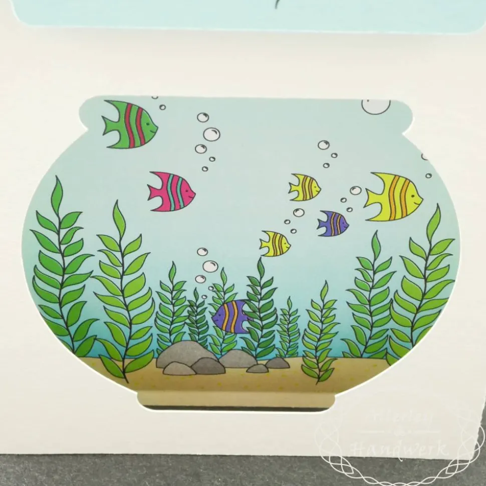 Sie lässt sich problemlos in einem normalen Umschlag unterbringen, aber sobald man sie herauszieht entfaltet sich der seitliche Shadow-Box-Mechanismus automatisch und erzeugt eine Tiefe von etwa 1,5 cm und somit auch einen tollen 3D-Effekt. Man schaut dann tatsächlich durch das Goldfischglas „ins“ Aquarium.