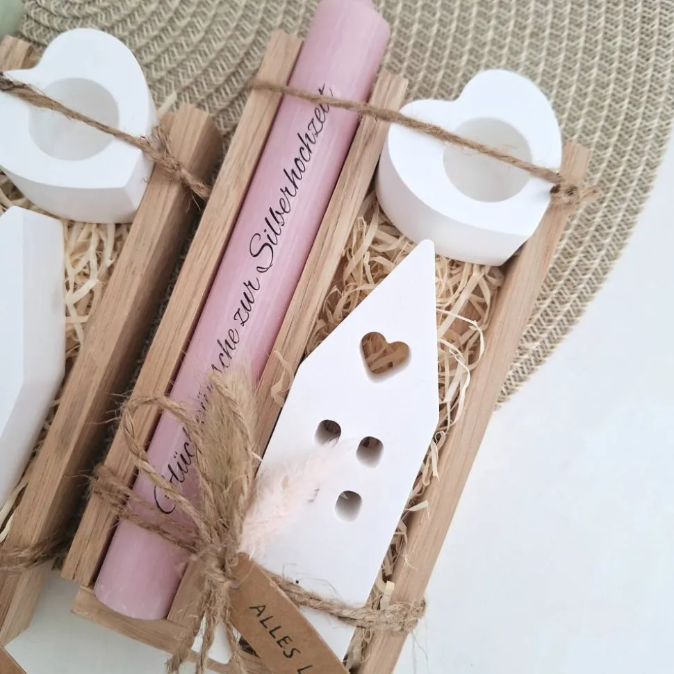 Das Geschenkset wird in einer Holzbox zusammengebunden, mit Trockenblumen (können variieren) verziert und mit einem Anhänger “ ALLES LIEBE “ ergänzt.