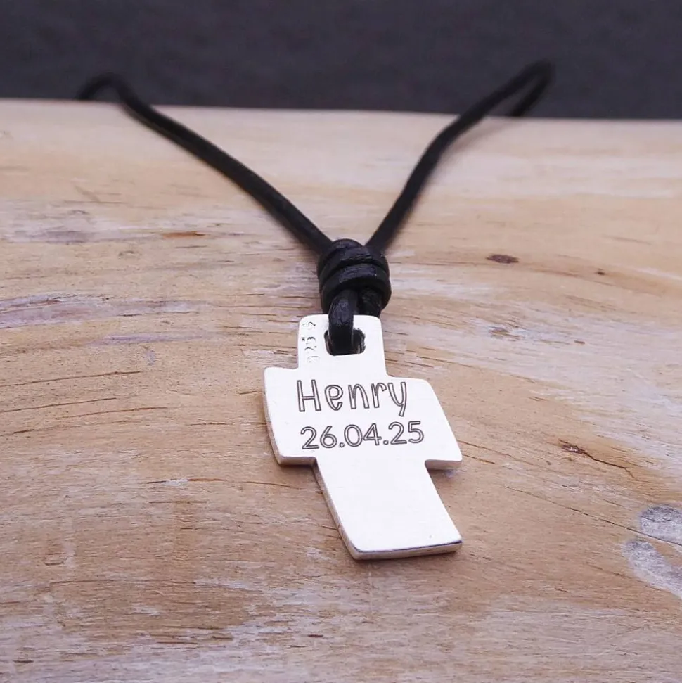 Ein Silberkreuz mit Schwung, in der Formgebung sehr schlicht und doch auffallend. Dieses frische Schmuckstück kann graviert werden und wäre somit das ideale Geschenk zur Kommunion, Konfirmation oder Firmung. Die Oberfläche ist matt, die Farbe des Lederbandes kann gewählt werden.