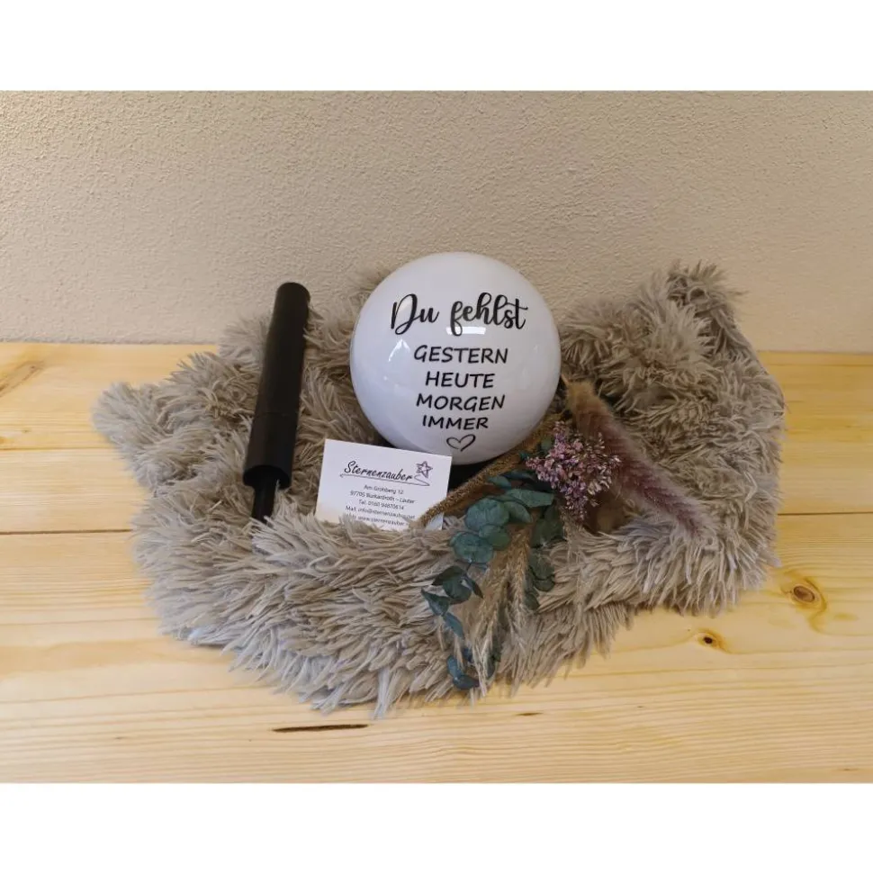 Die Solarkugel hat die Aufschrift „Du fehlst. Gestern. Heute. Morgen. Immer“.