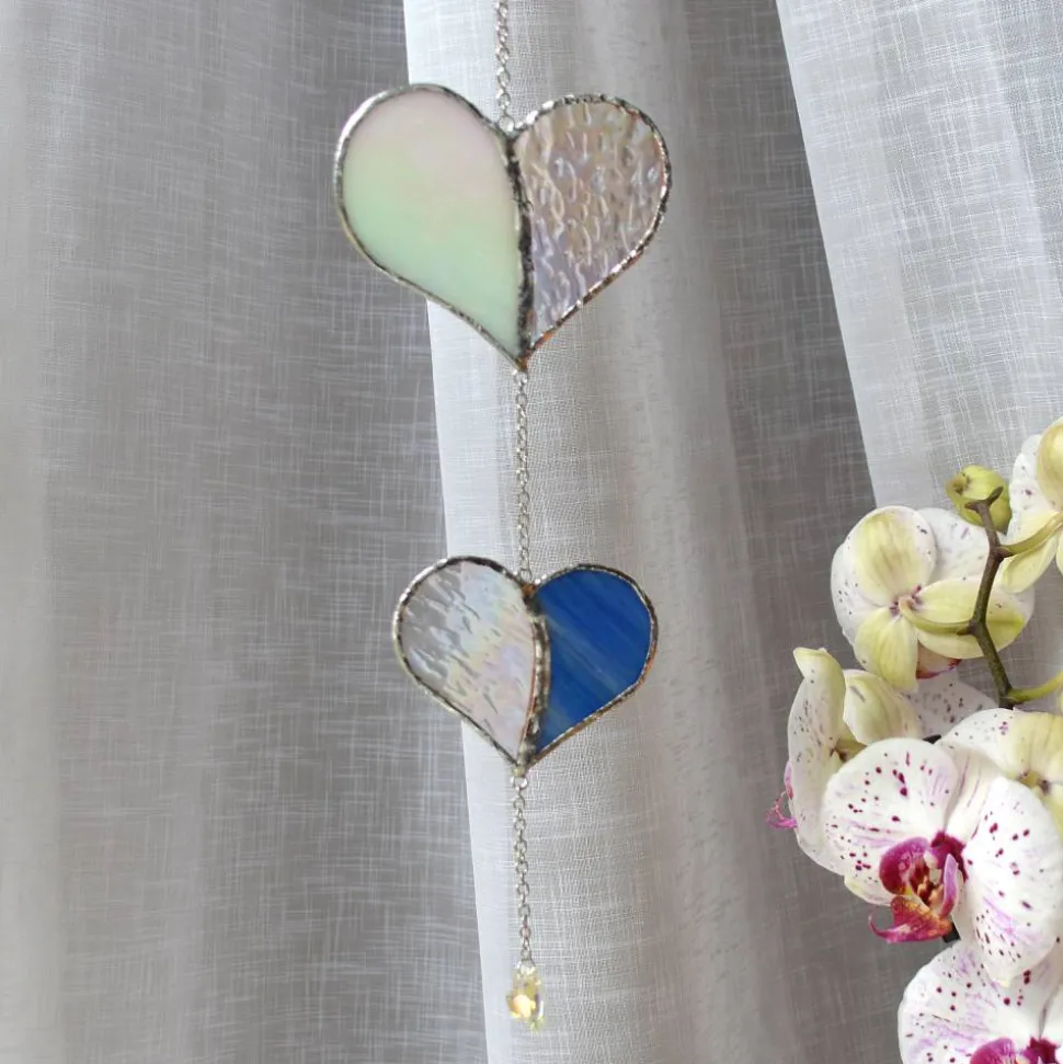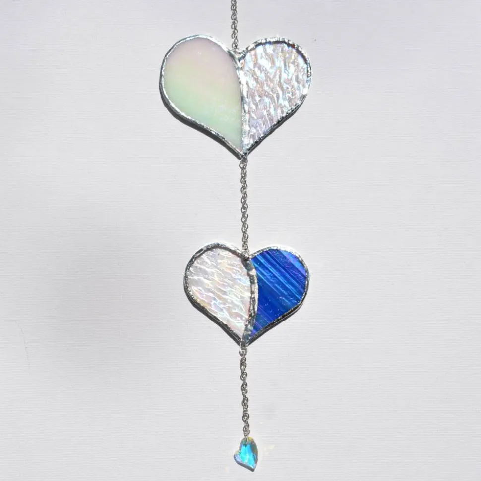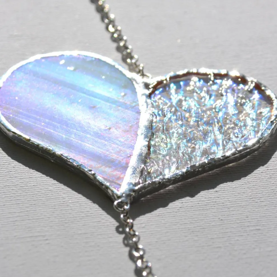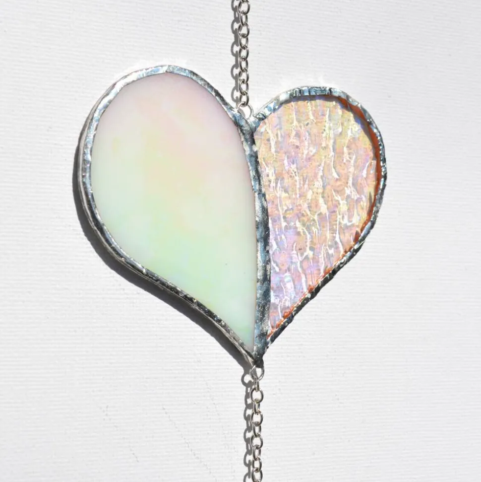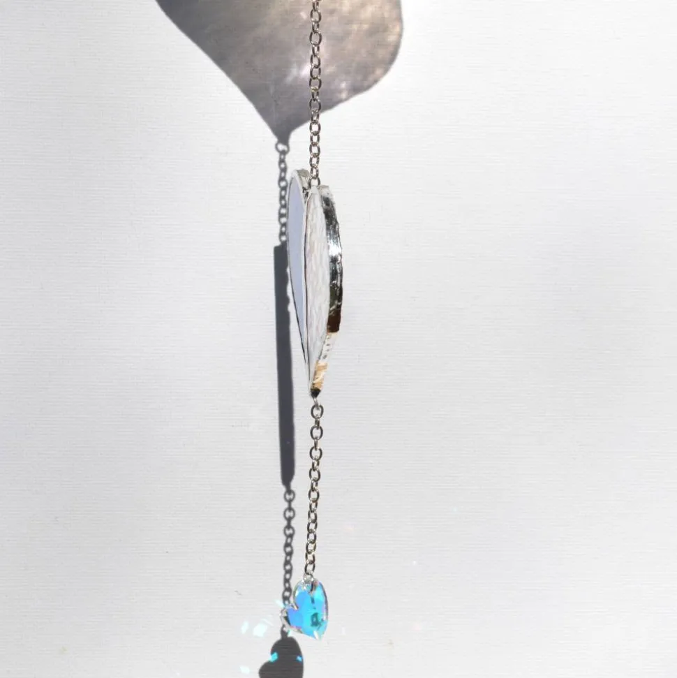 Das irisierende Glas reflektiert je nach Lichteinfall unterschiedlichste Farben – von sanften Pastelltönen bis hin zu leuchtenden Regenbogeneffekten. Die Struktur des Glases verleiht dem Sonnenfänger zusätzliche Tiefe, während die edlen Glaskristalle in Herzform für brillante Lichtreflexe sorgen.