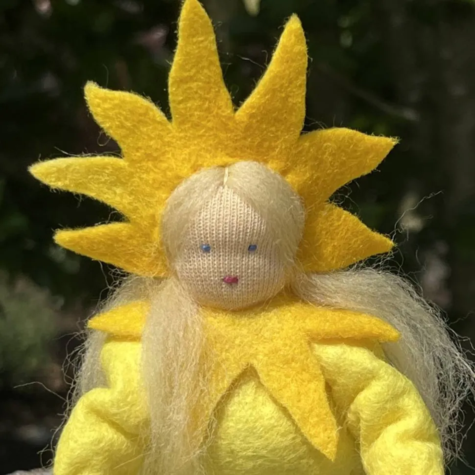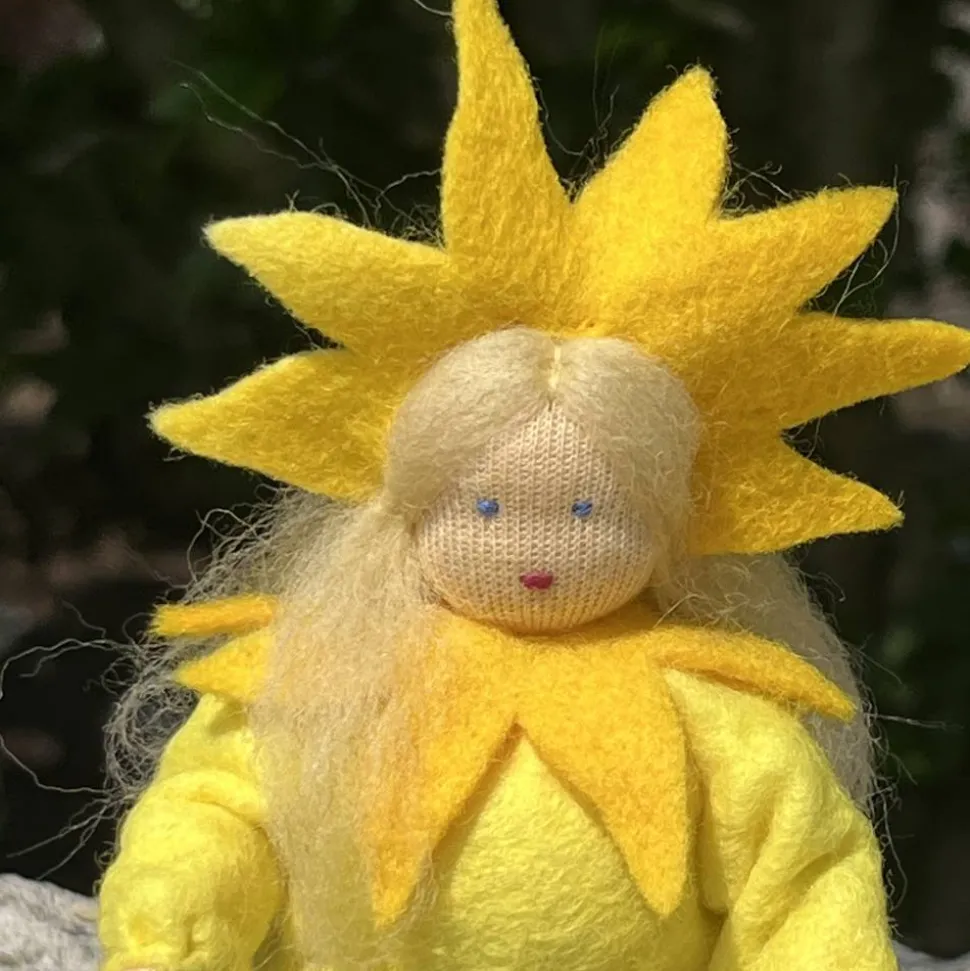 Sie sind ca 12 cm groß. Der Sonnenstrahlen kranz auf dem Kopf und der Kragen sind aus meliertem Wollfilz genäht.