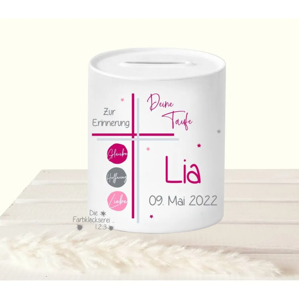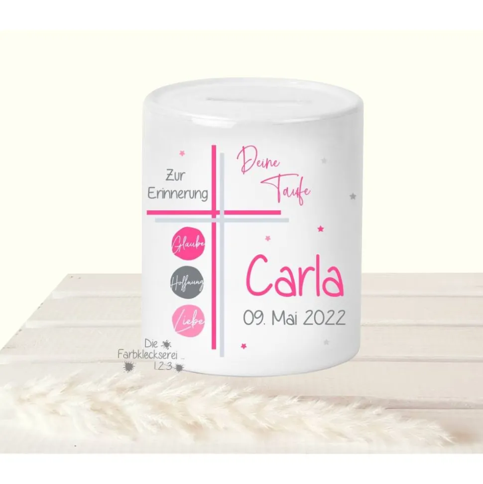 Tolles Sparschwein zur Taufe mit dem Namen des Taufkindes.