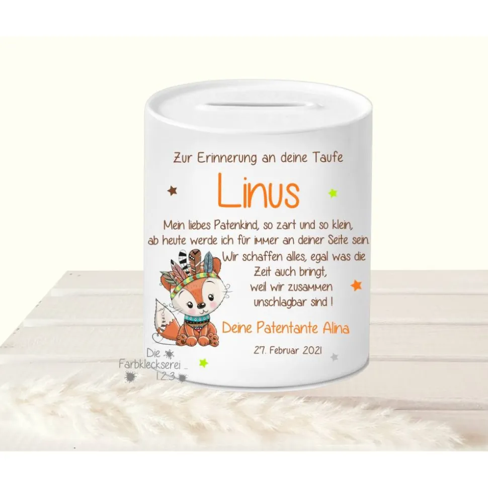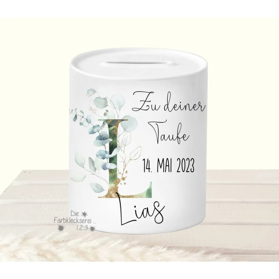 Zusätzlich wird das Sparschwein mit dem Taufdatum personalisiert
