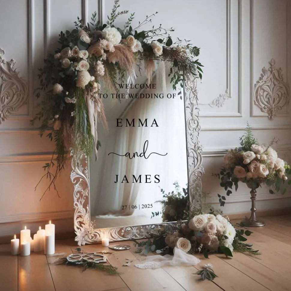 „Welcome to the wedding of“, zwei Namen und ein Datum.