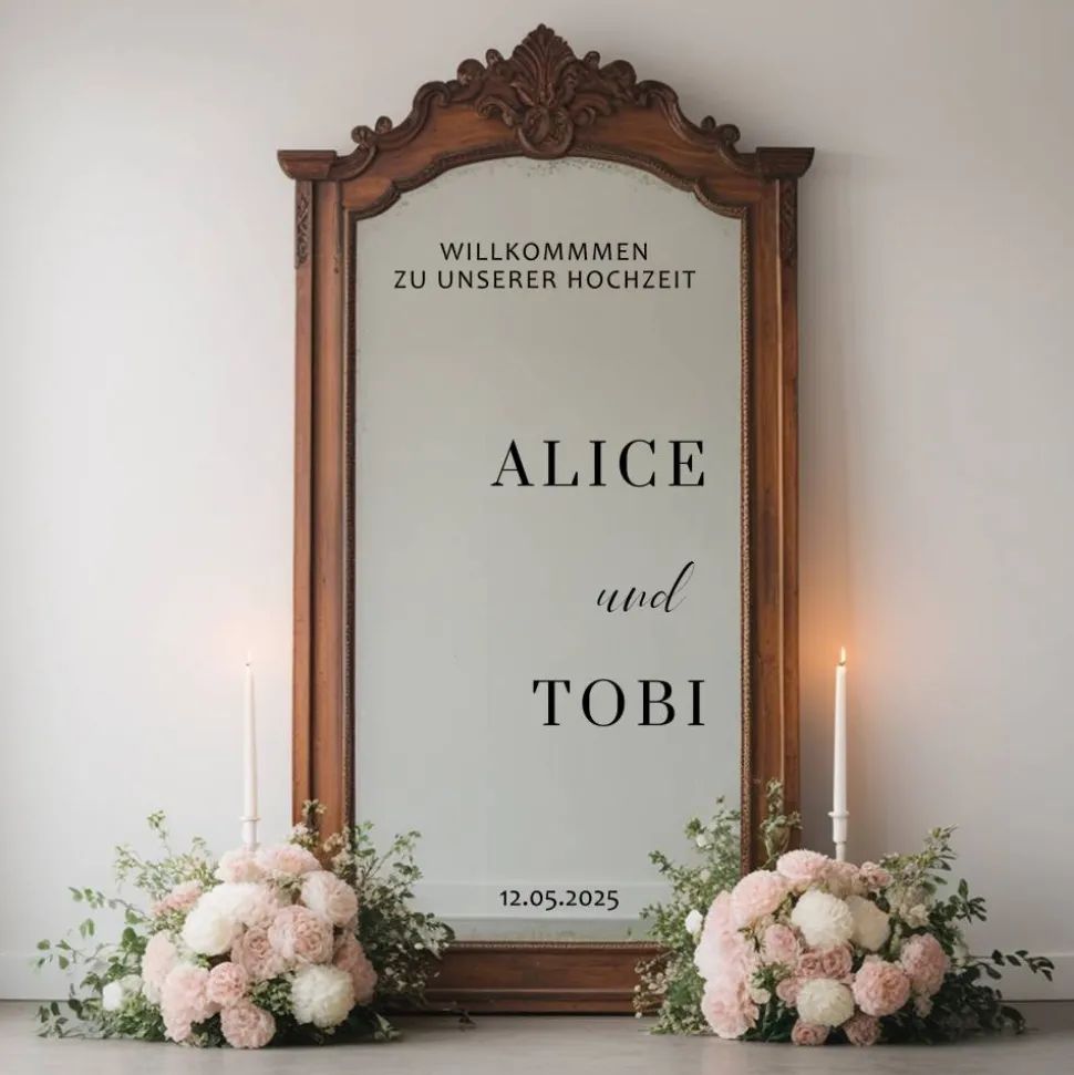 Auf Wunsch können wir „Willkommen zu unserer Hochzeit“ auch auf einer anderen Sprache (bspw. Englisch oder Türkisch) vorbereiten.