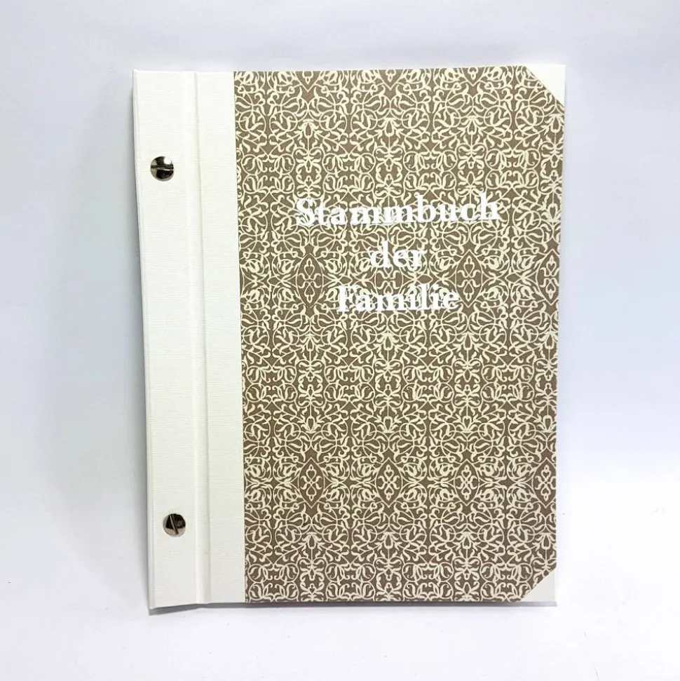 Das Stammbuch aus stabiler Buchbinderpappe ist am Rücken und den Ecken mit Buchbinderleinen bezogen. Das Überzugspapier ist Naturpapier.