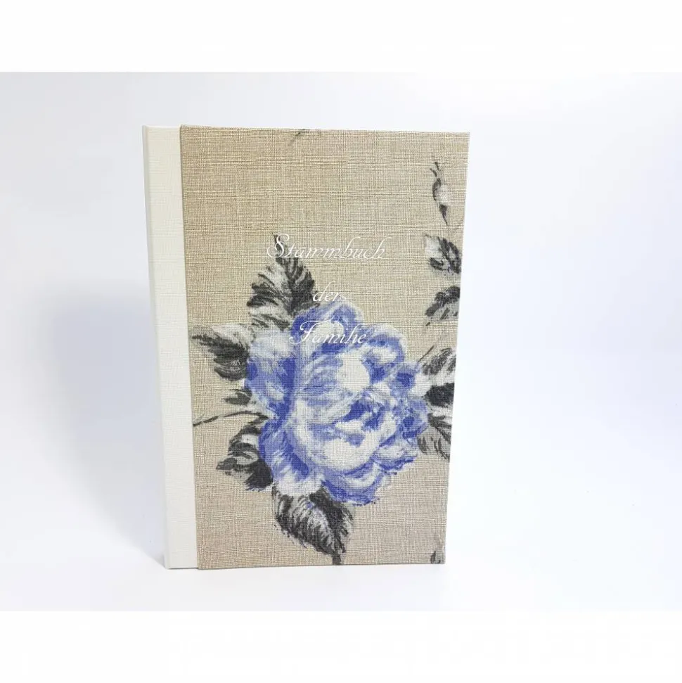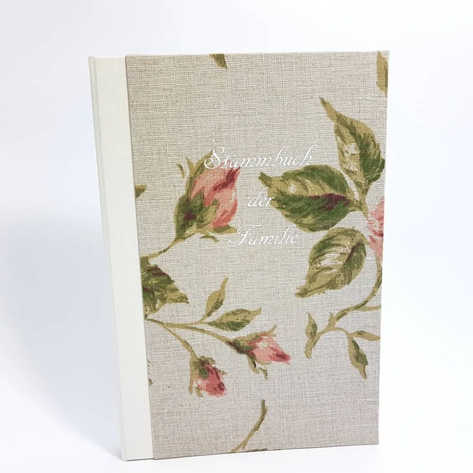 Das Stammbuch ist aus Buchbinderpappe, überzogen mit weißem Buchbinderleinen, der vordere Deckel mit einem romantischen Rosenstoff.