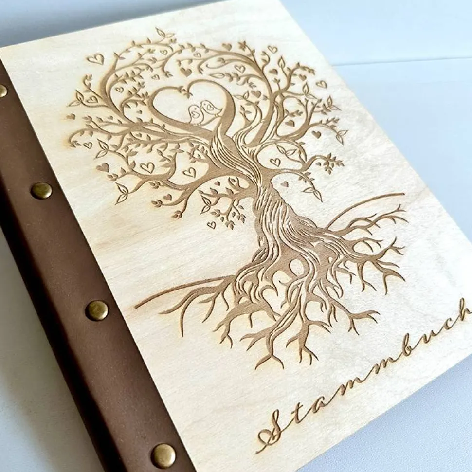 Das Stammbuch besteht aus formstabilen Birkenholz und besticht durch seine angenehme Haptik und einzigartiger Maserung – jedes Buchcover wird so zu einem absoluten Unikat.