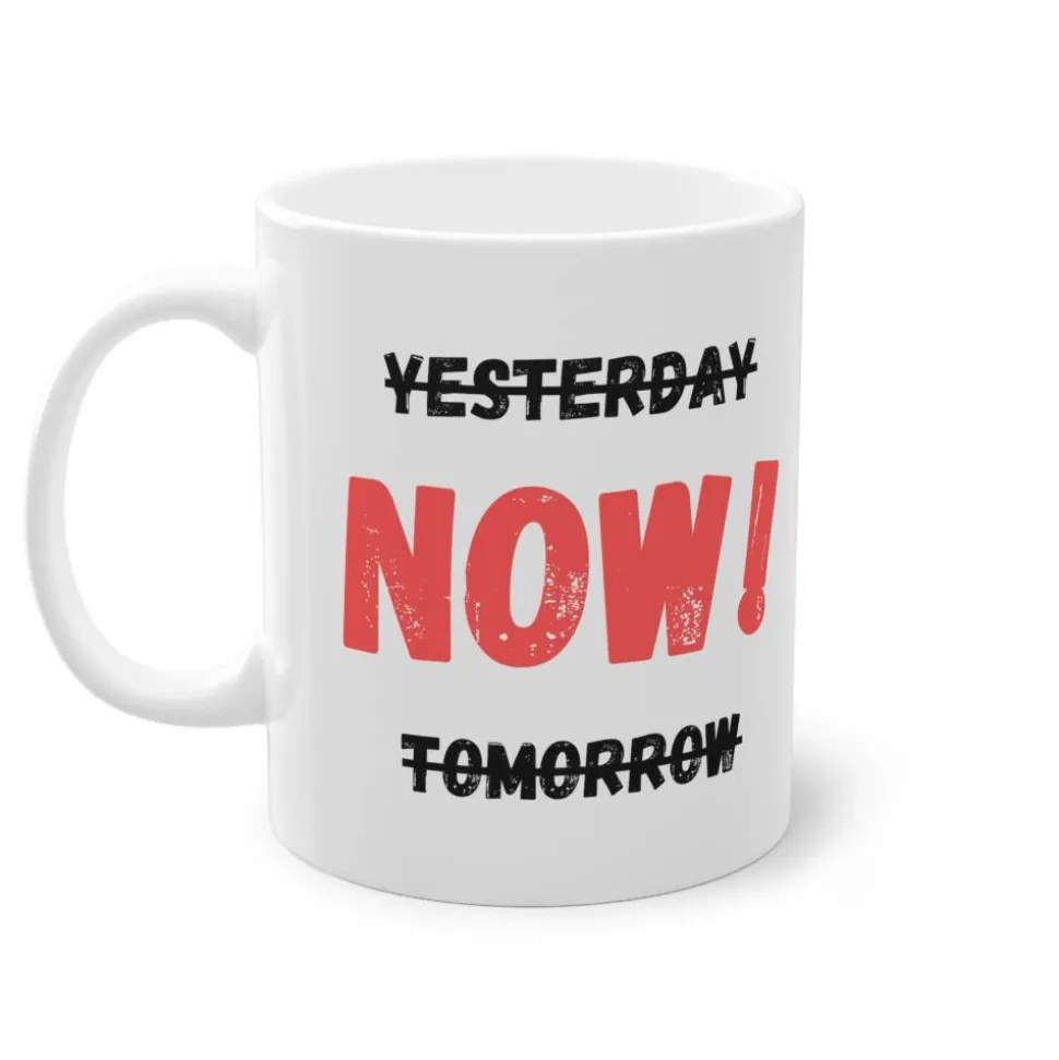Statement-Tasse „Yesterday – NOW! – Tomorrow“ | Motivationsbecher für Alltag & Büro
