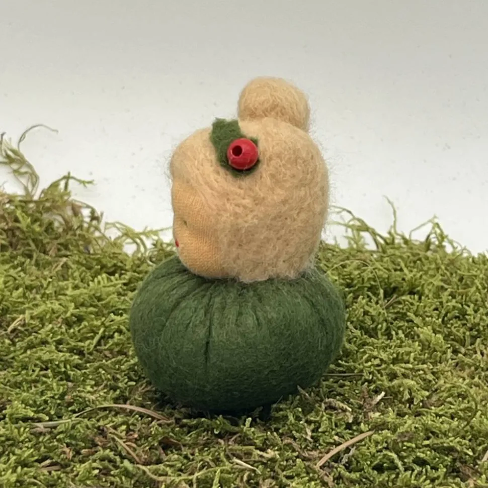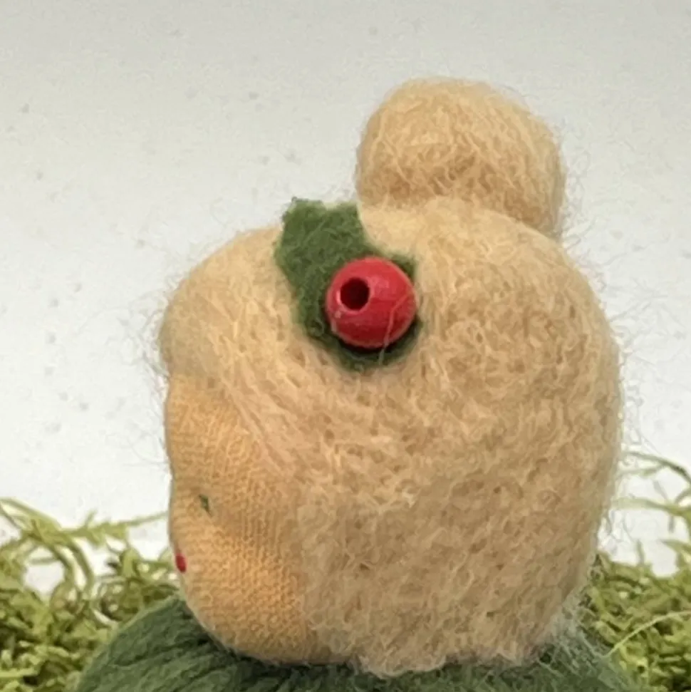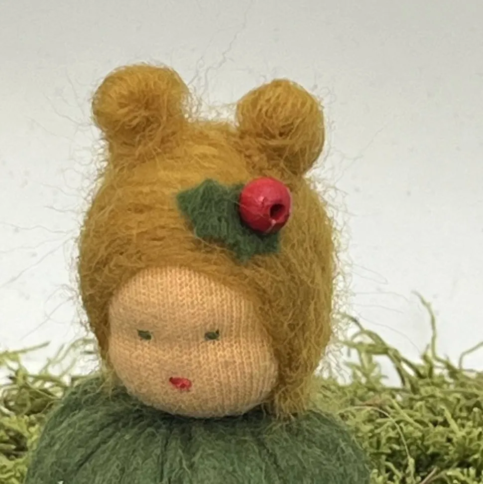 Sie sind ca. 6 cm groß. Auf dem Kopf haben sie ein kleines Stechpalmenblatt mit einer roten Holzperle.