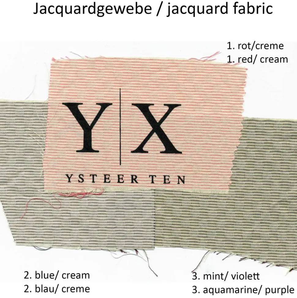 Jacquardgewebe in 1. rot/ creme, 2. blau/ creme oder 3. mint/violett: 90% Baumwolle, 10% Polyester (feiner italienischer Stoff mit mattem Glanz)