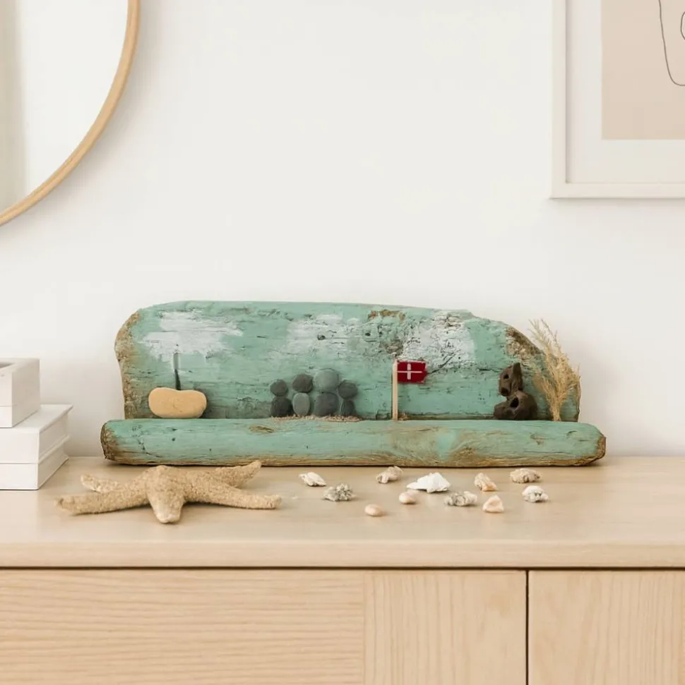Das verwendete Treibholz und die Strandfunde stammen von der dänischen Küste und bringen dir das echte Hygge-Gefühl. Die handgefertigte dänische Fahne aus Glas und das kleine Segelboot aus Strandgut machen jedes Stück zum Unikat und sorgen für eine besondere maritime Atmosphäre.