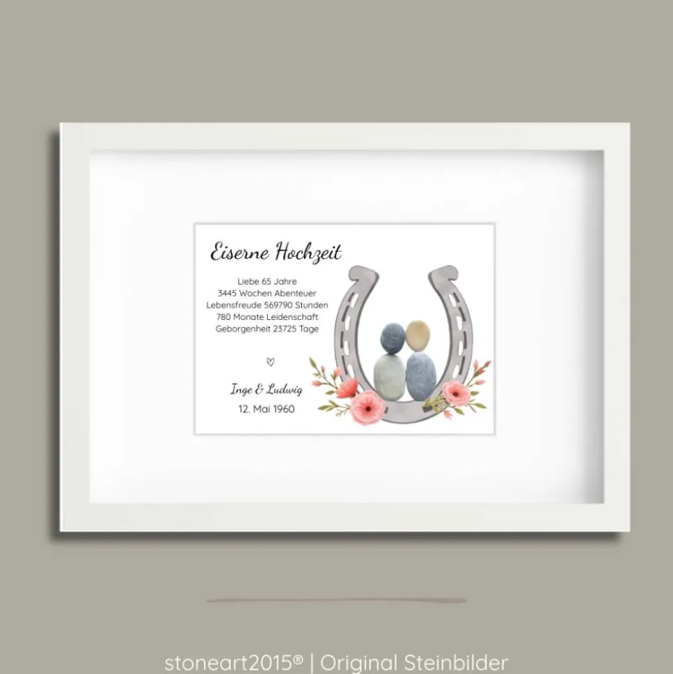 Feiere die Eiserne Hochzeit und würdige 65 Jahre Ehe mit einem einzigartigen, handgefertigten Steinbild als persönliches Geschenk. Eisen steht für Beständigkeit, Stärke und tiefe Verbundenheit – genau diese Werte spiegeln sich in jedem einzelnen Steinbild wider, das liebevoll aus natürlichen Kieselsteinchen gestaltet wird. Jedes Kunstwerk ist ein einzigartiges Unikat und unterstreicht die besondere Bedeutung dieses Jubiläums.