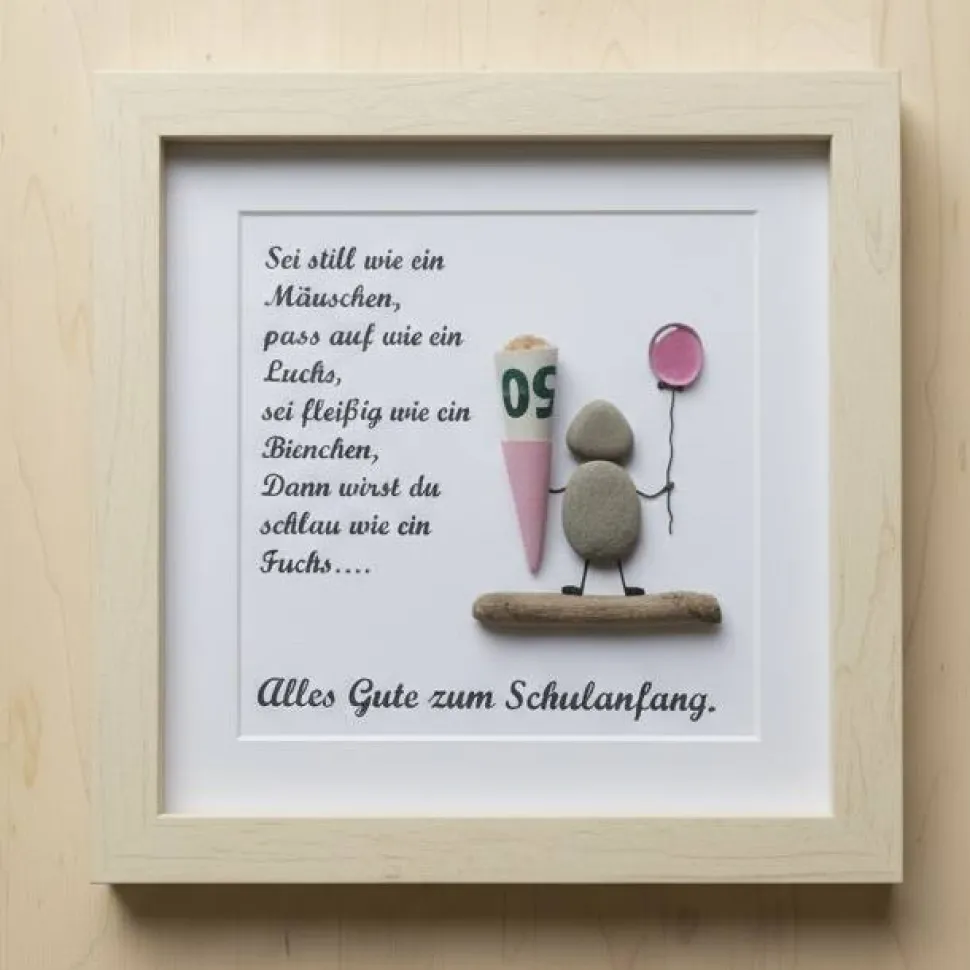 Ein wunderschönes handgefertigtes Steinbild zum Schulanfang – ideal als liebevolles Geldgeschenk zur Einschulung für ein Schulkind.