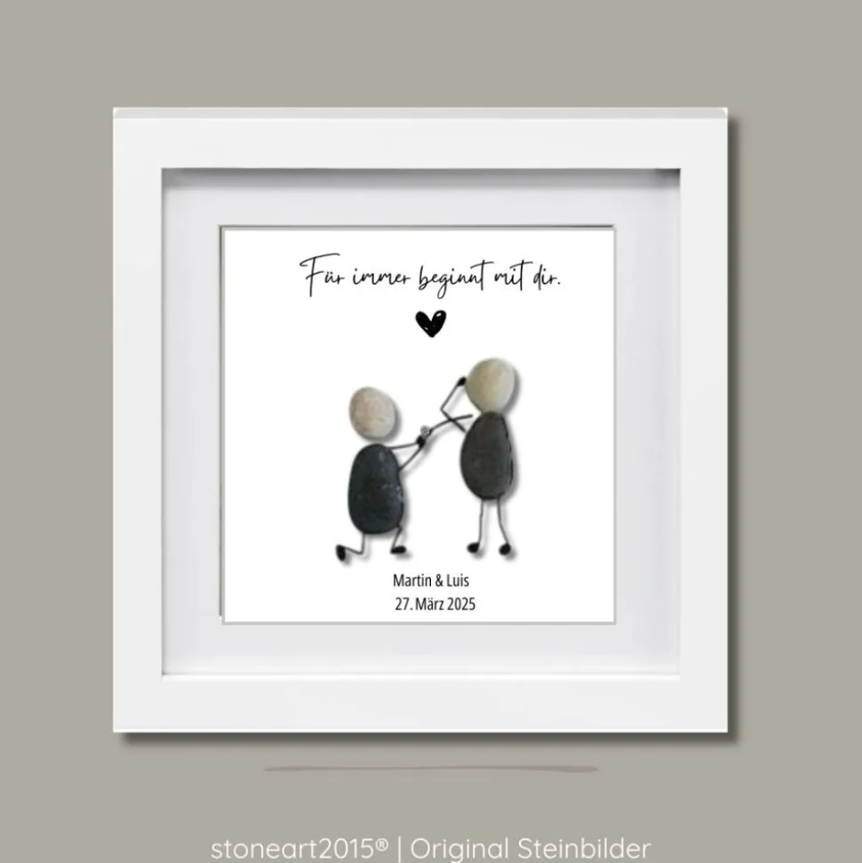 Dein persönliches Hochzeitsgeschenk wird mit viel Liebe zum Detail handgefertigt. Gib einfach die gewünschten Namen und das Hochzeitsdatum an, um ein wirklich einzigartiges Unikat zu erhalten. Das Steinbild eignet sich ideal als stilvolle Dekoration im neuen Zuhause und erinnert täglich an die Liebe und den gemeinsamen Lebensweg.