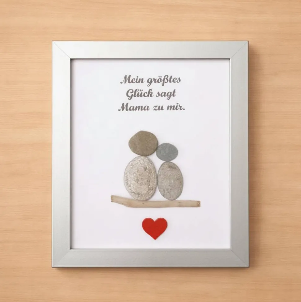 Dieses liebevoll gestaltete Bild zeigt eine Mutterfigur mit Kind aus echten Natursteinen, die gemeinsam auf einem Naturholz-Element sitzen. Ergänzt wird das Motiv durch ein rotes Herz unterhalb der Figuren sowie den emotionalen Spruch: