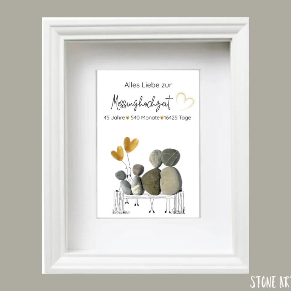 Feiere die Messinghochzeit, den 45. Hochzeitstag, mit einem besonderen handgefertigten Steinbild als Geschenk. Nach 45 gemeinsamen Ehejahren steht die Messinghochzeit symbolisch für Beständigkeit, Wertigkeit und eine gereifte, stabile Beziehung. Dieses liebevoll gestaltete Steinbild vereint natürliche Kieselsteinchen, hochwertige Materialien und individuelle Personalisierung zu einem einzigartigen Unikat, das lange Freude bereitet.
