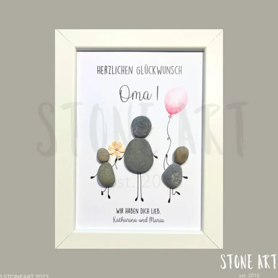 Überrasche deine Oma mit einem einzigartigen, handgefertigten Steinbild! Dieses liebevoll gestaltete Kunstwerk ist das perfekte Geschenk zum 60., 65. oder 70. Geburtstag deiner Oma – aber auch einfach so, um ihr deine Liebe zu zeigen. Jedes Steinbild wird nach deiner Bestellung individuell angefertigt und ist somit ein echtes Unikat. Du kannst es auch für Opa oder eine andere besondere Person verschenken!